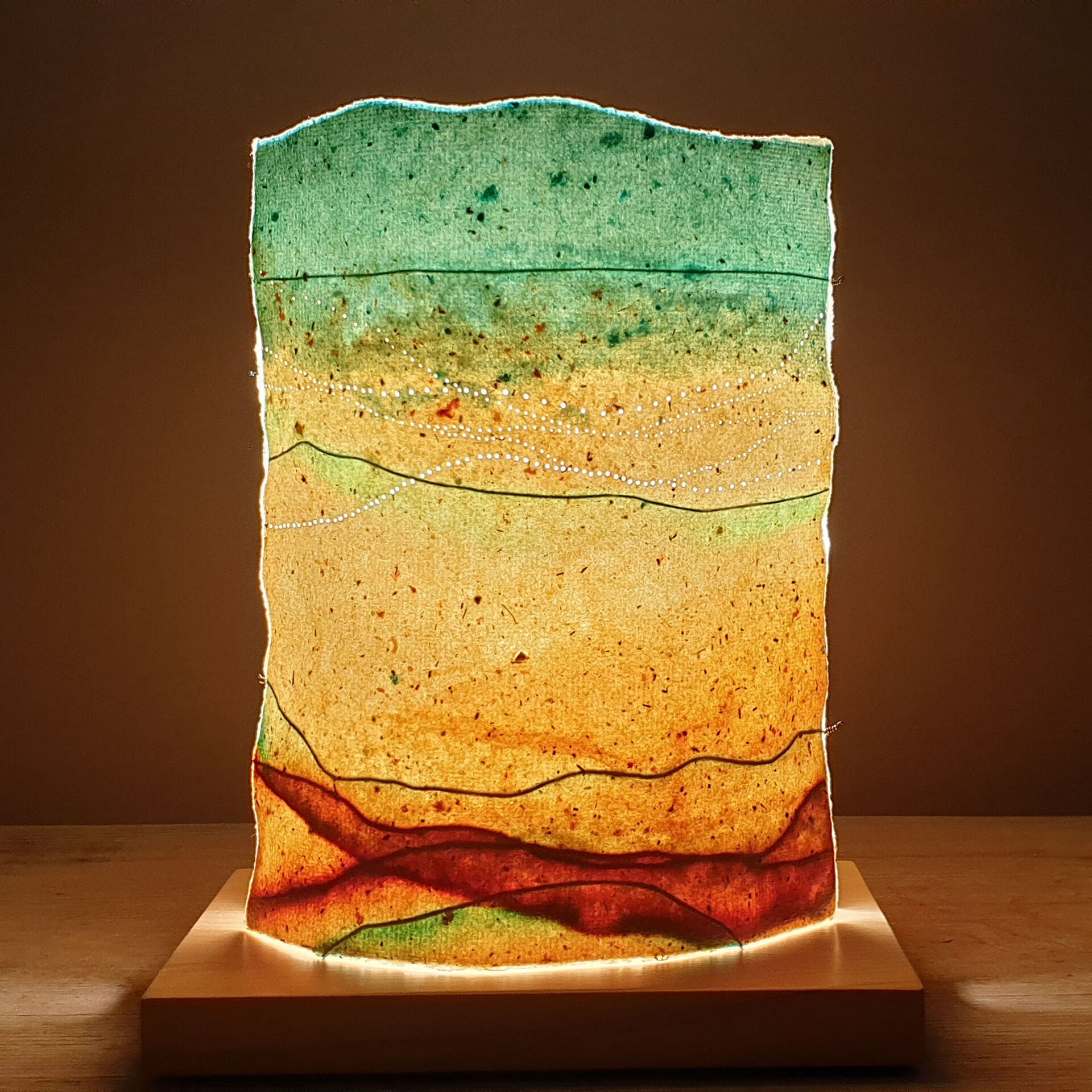 Handmade recycled paper Copper and steel wire Inclusions: seagrass Wooden base – Norfolk Island Pine LED globe 3w 240V Measurements given include the base