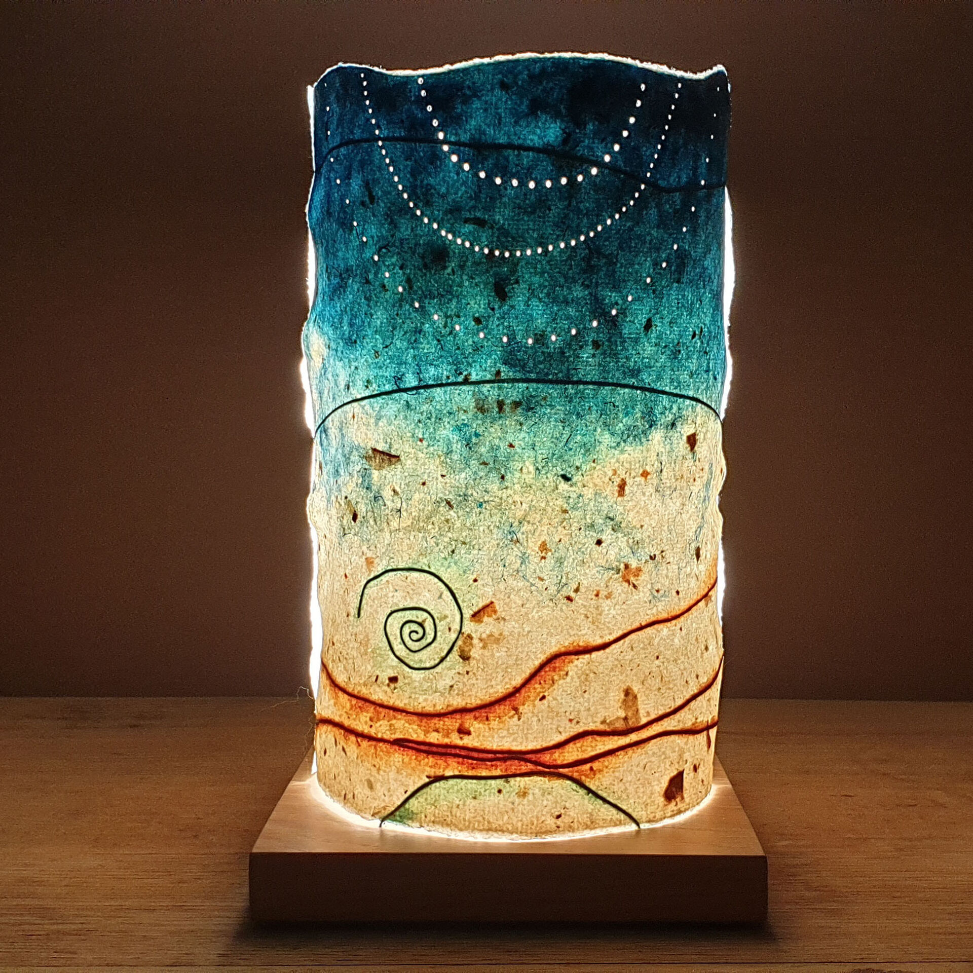 Handmade recycled paper Copper and steel wire Wooden base – American Oak LED globe 3w 240V Measurements given include the base