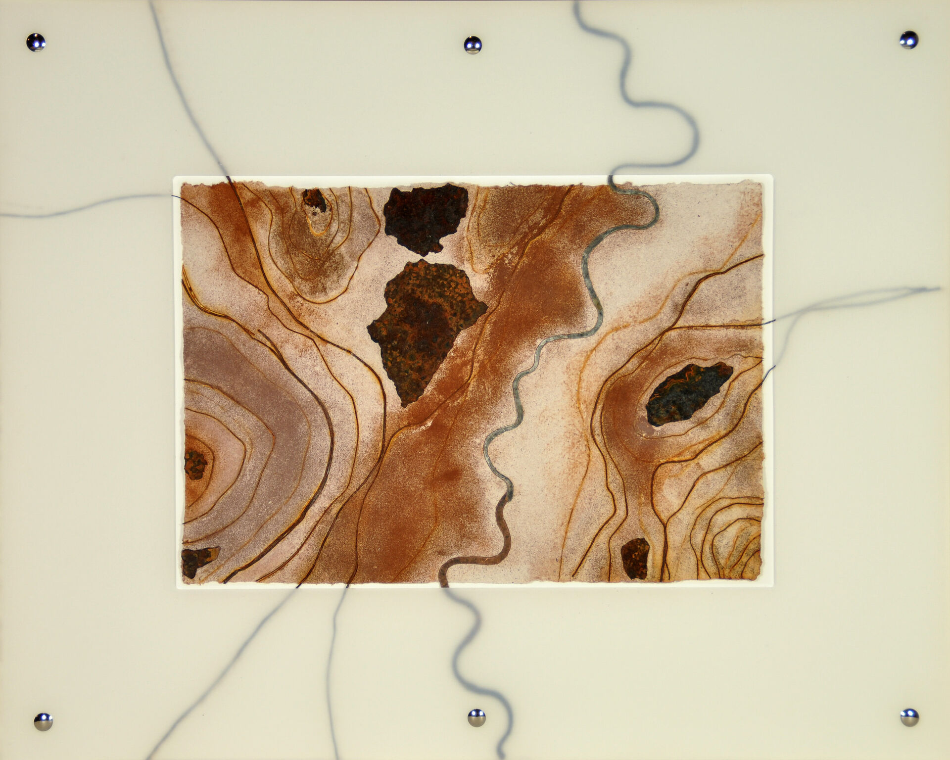 Handmade recycled cotton rag paper Wire – copper, tinned copper, steel Oxide, ground Siltstones Rust pieces Acrylic frame – inner & outer