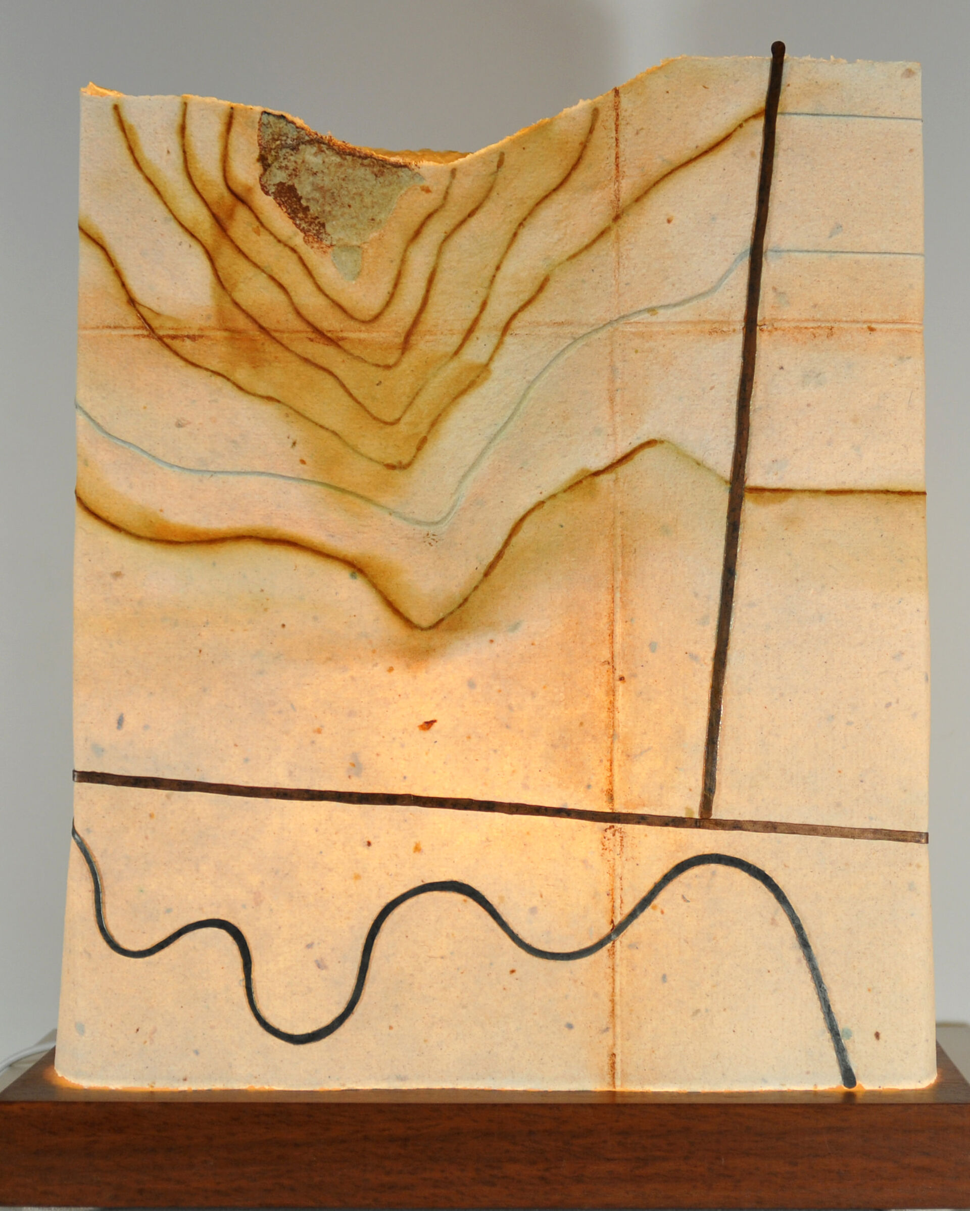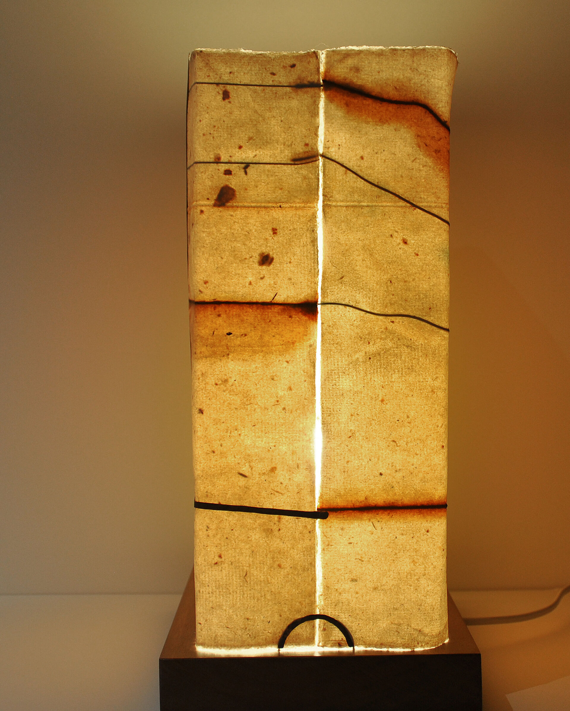 Handmade recycled cotton rag paper Wire – copper, tinned copper, steel Oxide Rust pieces Wooden base (Jarah), LED globe